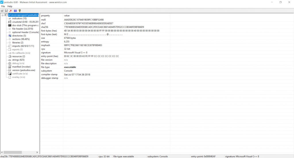 A useful program for malware analysis. Prestudio automatically scans files samples with VirusTotal, offers an interesting view of the analyzed application’s import table functions, shows the application’s viral markers, used libraries and PE file header info. It also enables you to work with resources. In other words, this is a versatile antivirus tool for initial sample analysis.